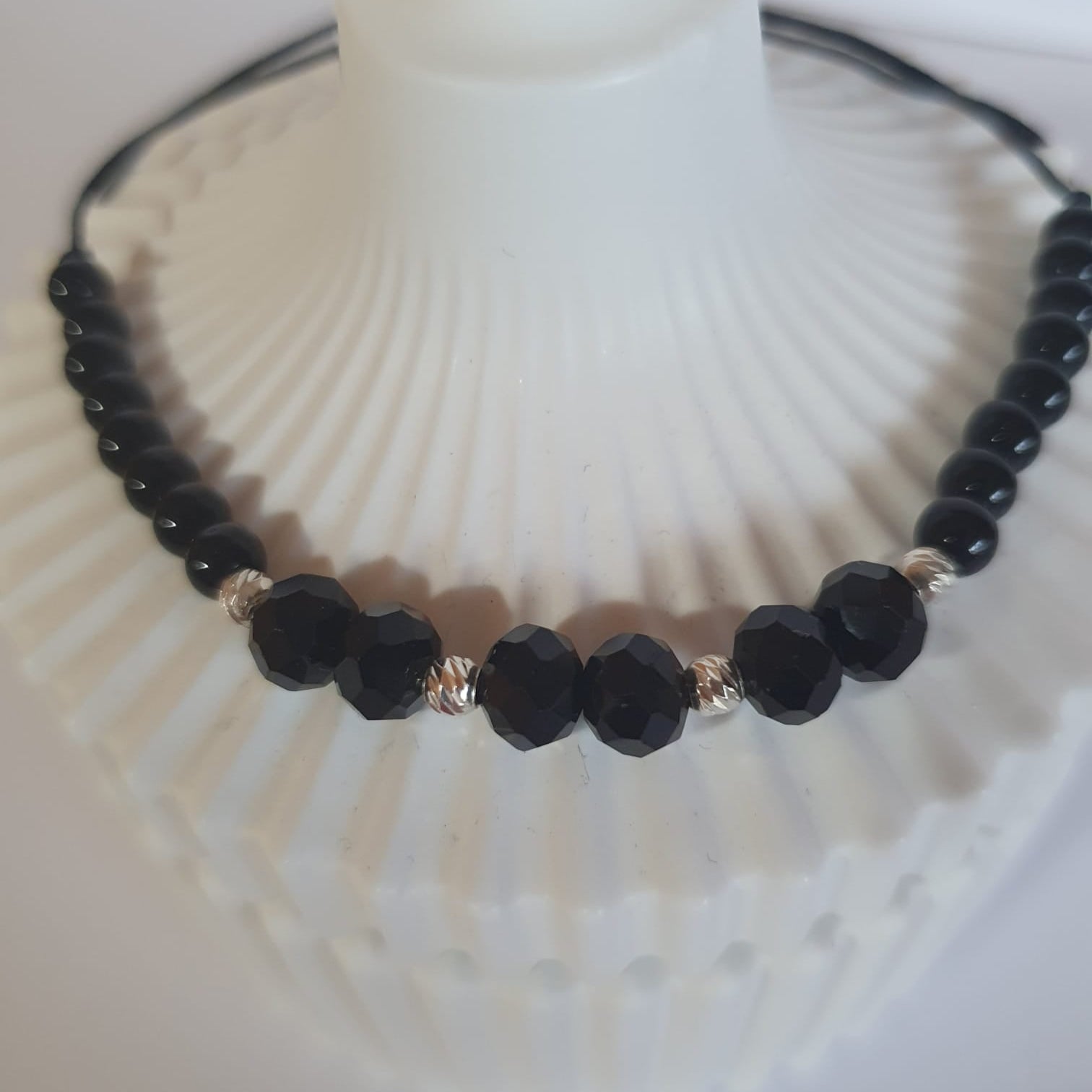This stunning bracelet combines smooth 4mm onyx beads with sparkling glass crystals and elegant silver details, creating a captivating accessory that enhances any look. Its refined craftsmanship and balanced design make it a perfect choice for adding a subtle yet striking touch of sophistication to your style. Make a statement with this versatile and timeless piece.