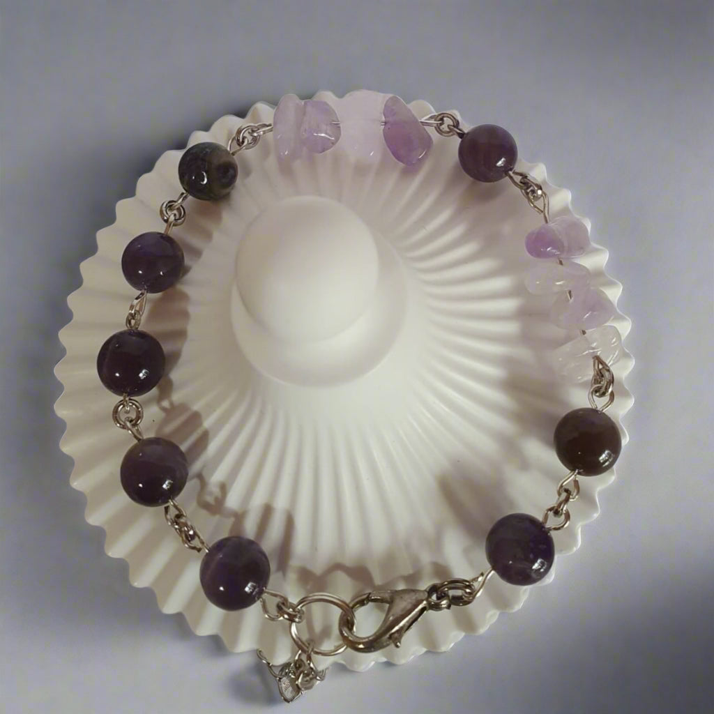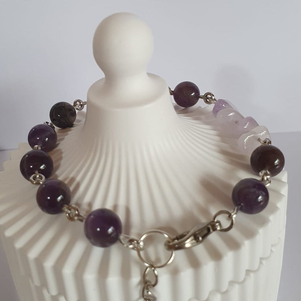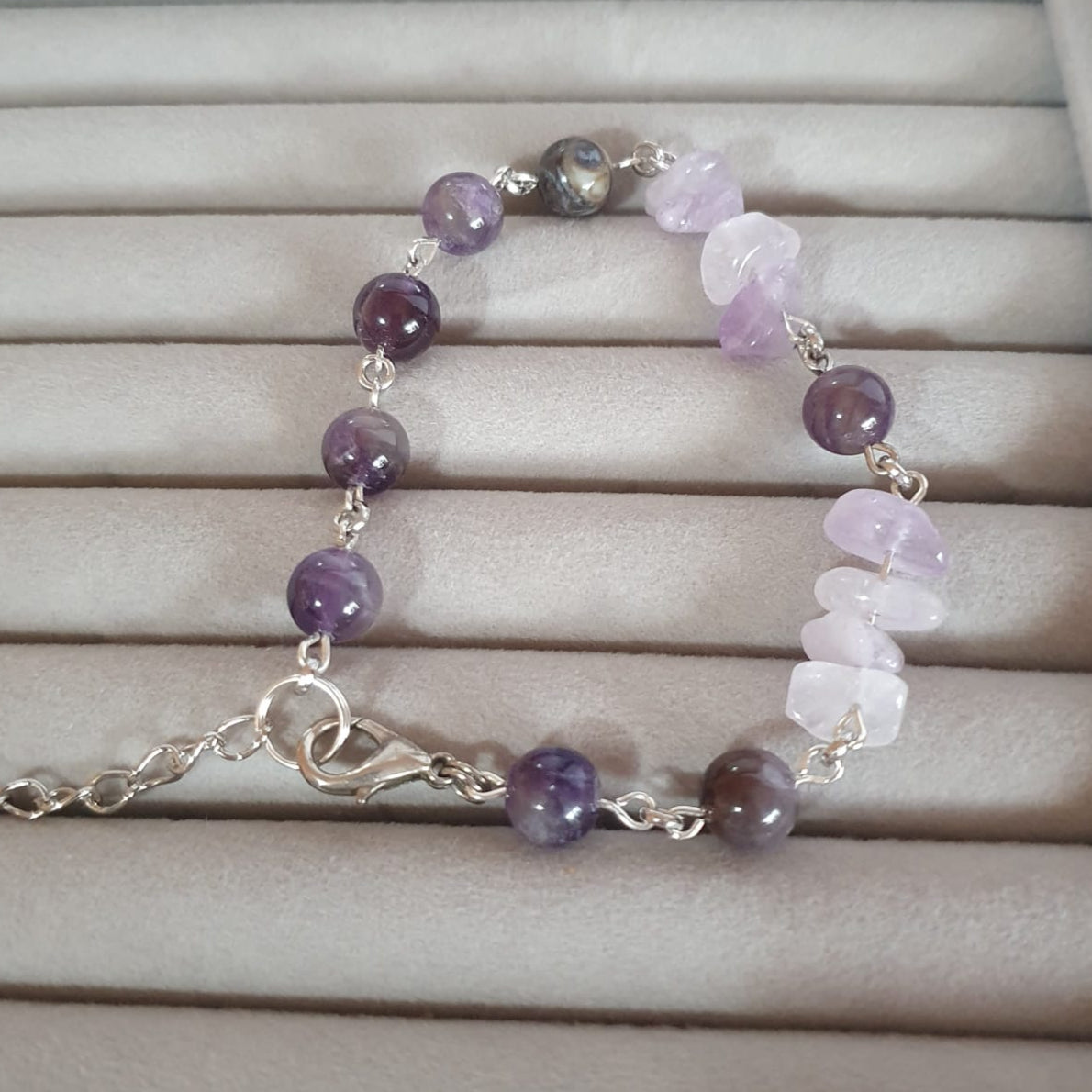 Experimentează frumusețea captivantă a ametistului cu ajutorul brățării noastre fermecătoare. Nuanțele sale de violet intens și textura netedă vor adăuga o notă de eleganță oricărei ținute. Perfectă pentru orice ocazie, răsfață-te pe tine sau pe o persoană dragă cu această bijuterie atemporală. Fiecare piatră este unică, ceea ce o transformă într-un accesoriu unic.