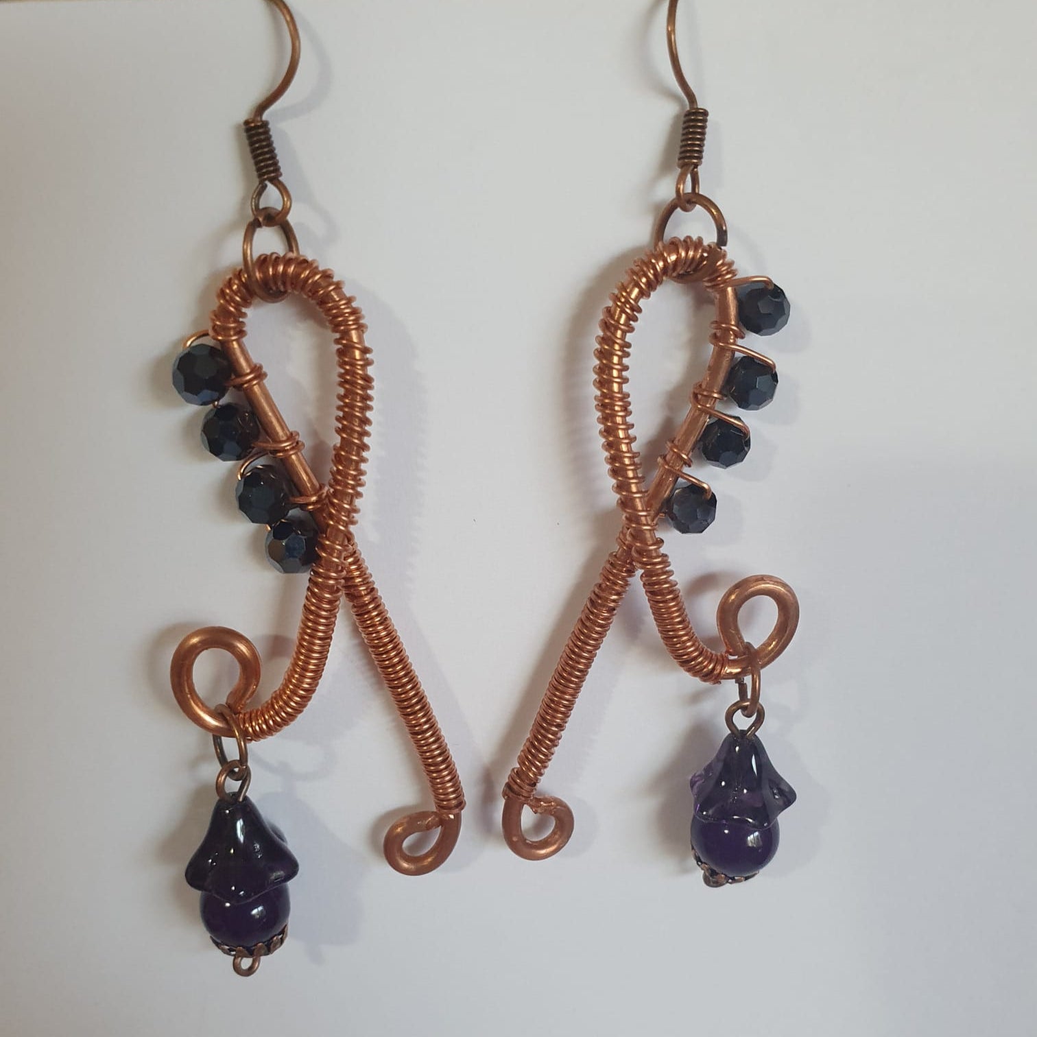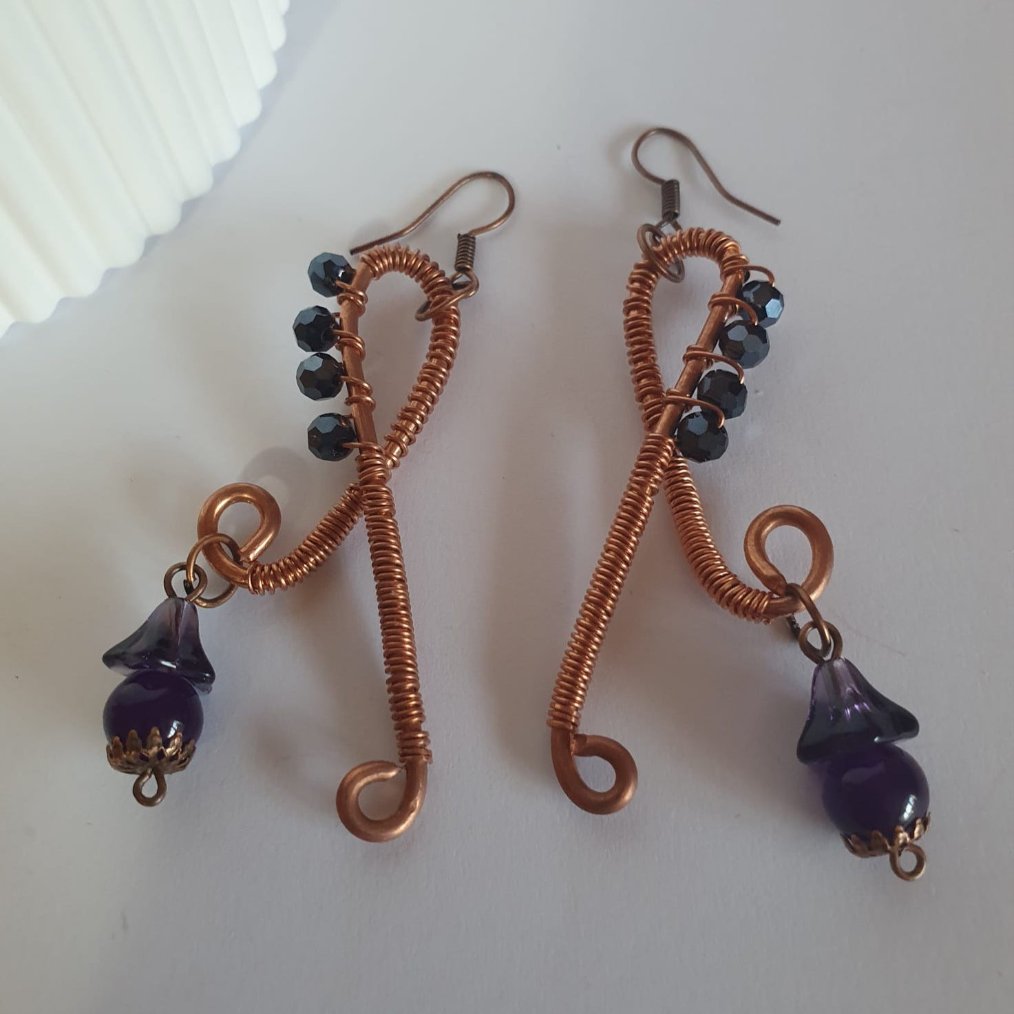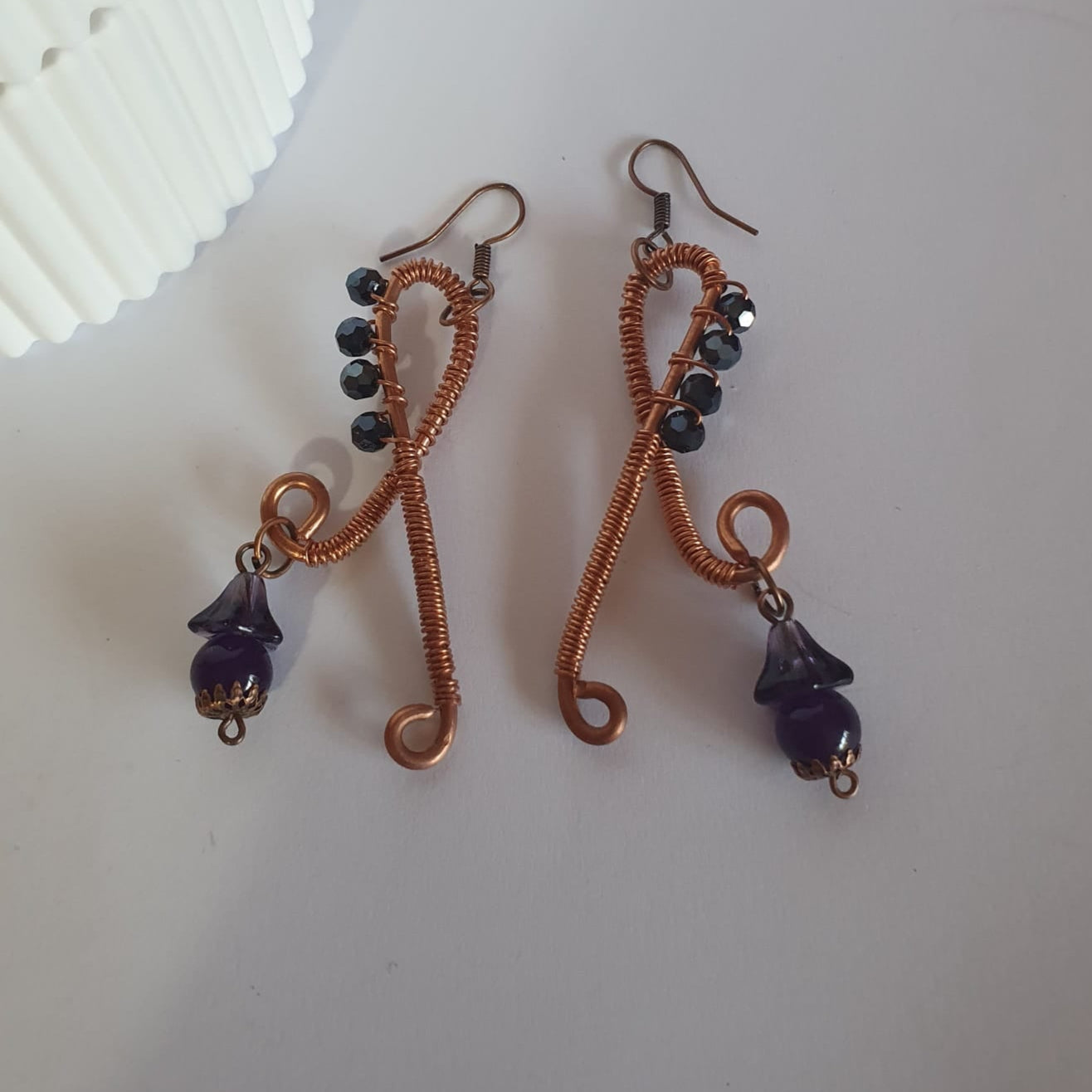 Acești cercei uimitori din cupru sunt decorați cu cristale de sticlă orbitoare și pietre prețioase de ametist. Adaugă o notă de eleganță și sofisticare oricărei ținute cu acești cercei unici și atrăgători. Perfecți pentru orice ocazie, acești cercei sunt o piesă obligatorie pentru orice colecție de bijuterii. Îmbogățește-ți ținuta cu frumusețea și strălucirea cuprului și a ametistului.