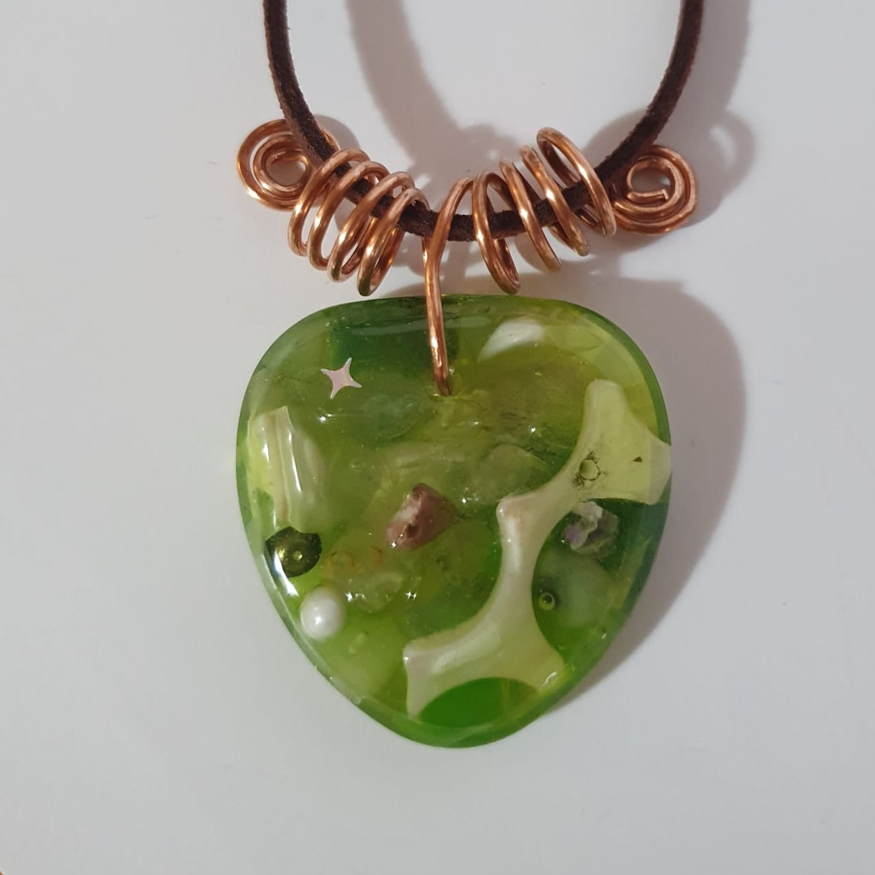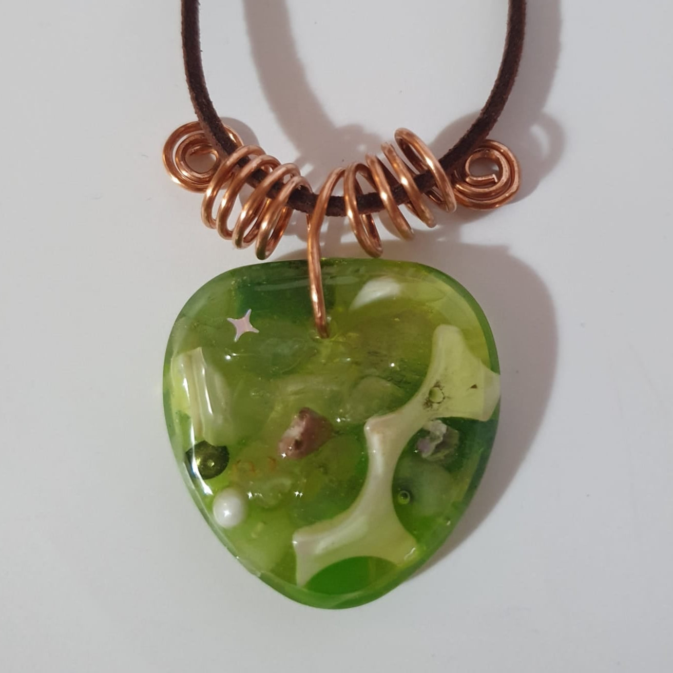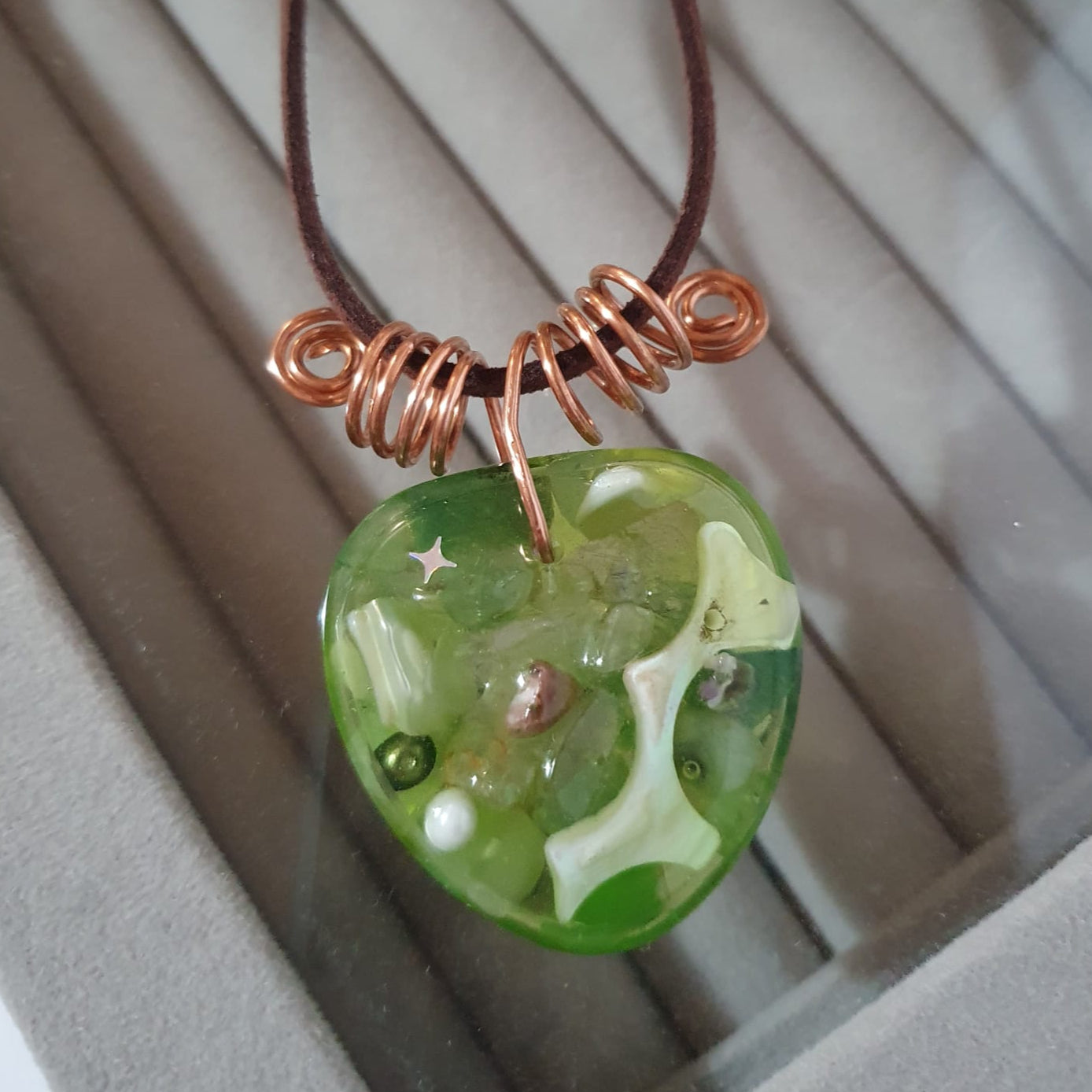 Experimentează frumusețea naturii cu colierul nostru din cupru și rășină. Realizat cu mărgele semiprețioase și bucăți de scoici, fiecare piesă este încapsulată individual în rășină pentru a crea un design unic și atrăgător.