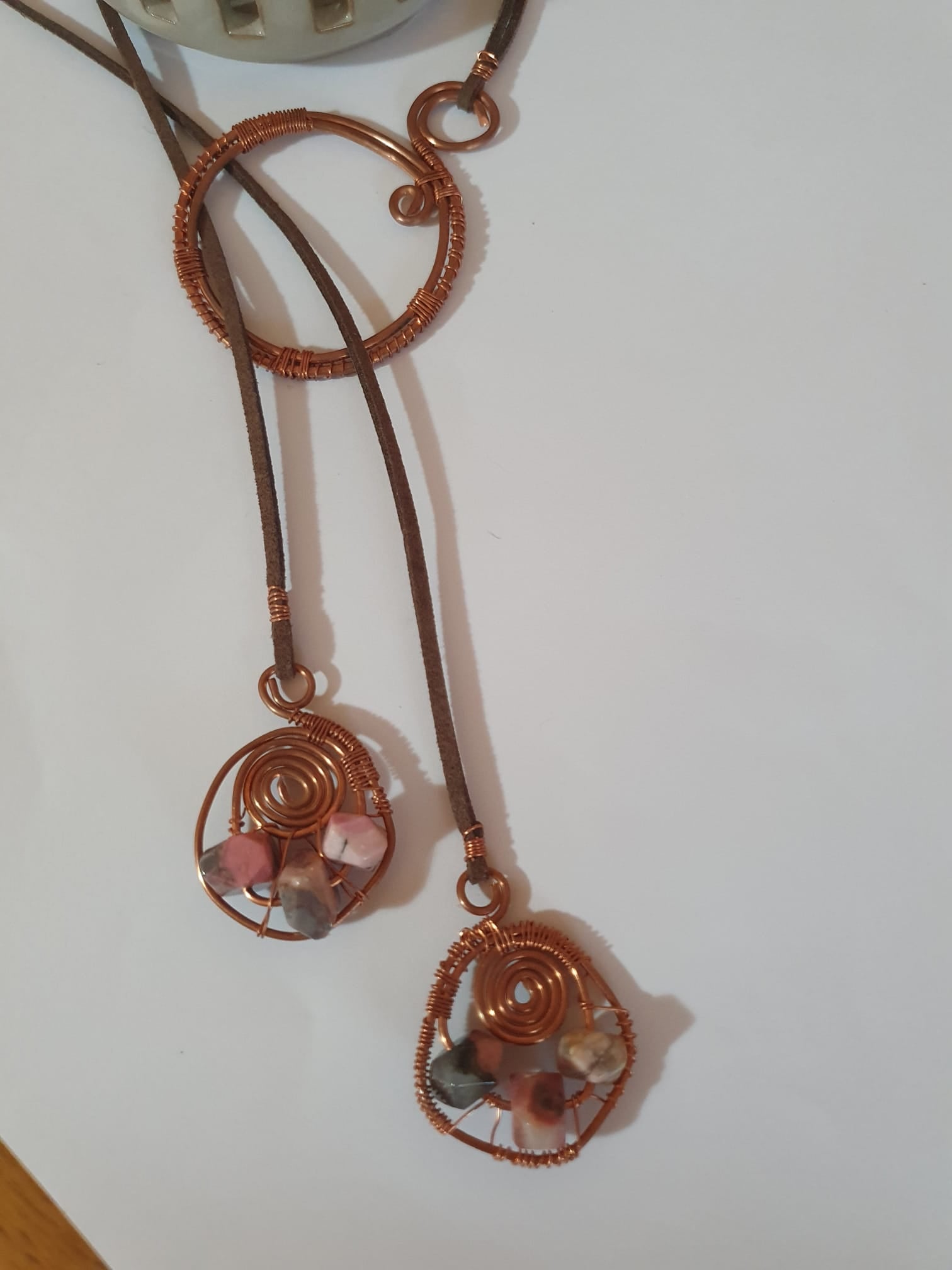 This copper and resin necklace showcases semi-precious stones set in a unique, handcrafted design. Its combination of warm copper tones and vibrant stones offers a distinctive, stylish look that complements any wardrobe. Perfect for adding a refined and natural touch to your everyday or formal outfits.
