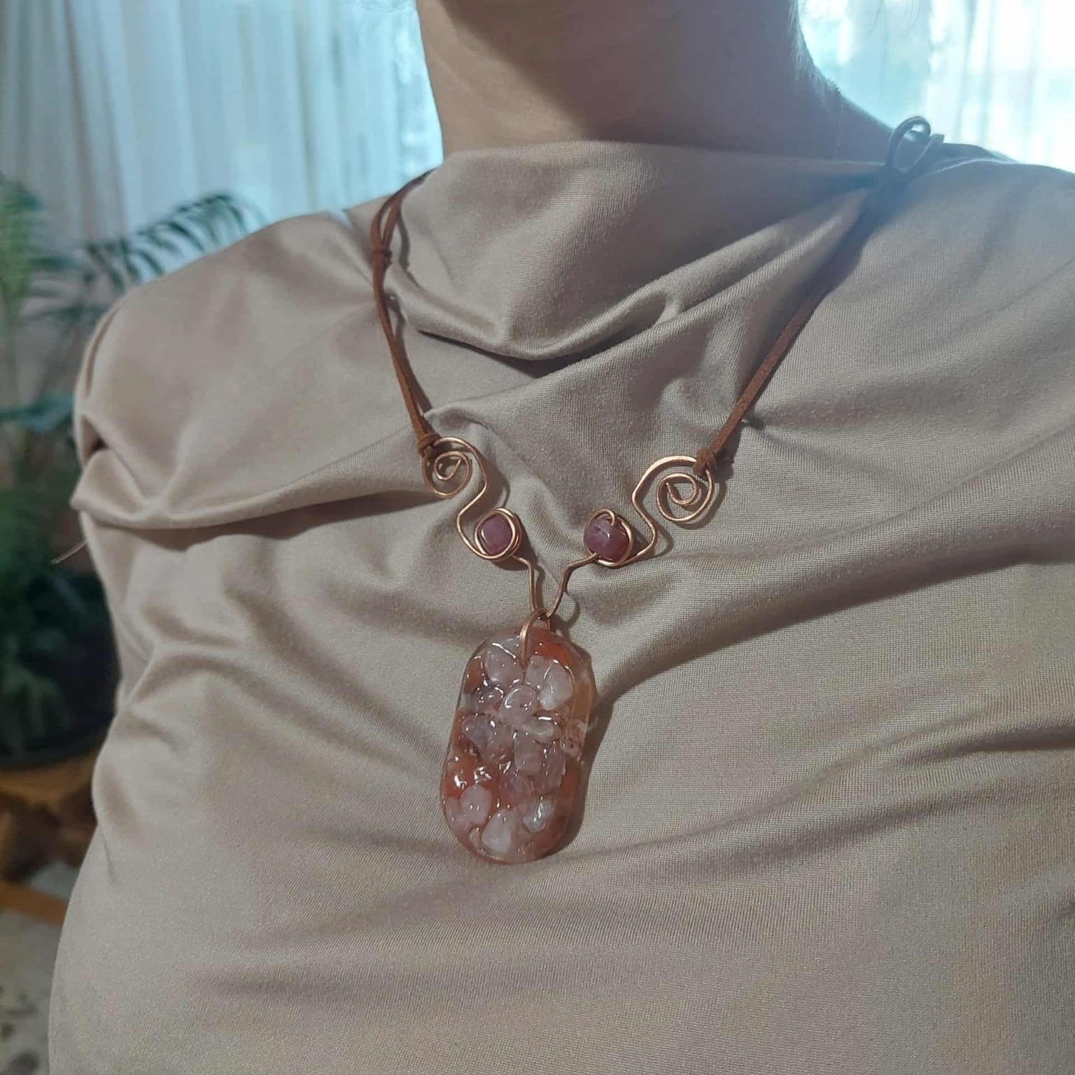 This copper and resin necklace features carefully selected semi-precious stones, blending natural beauty with artistic design. Lightweight yet durable, it adds a unique charm to any outfit, making it an ideal accessory for both everyday wear and special occasions. Enhance your style with this handcrafted piece that brings a touch of elegance and individuality.
