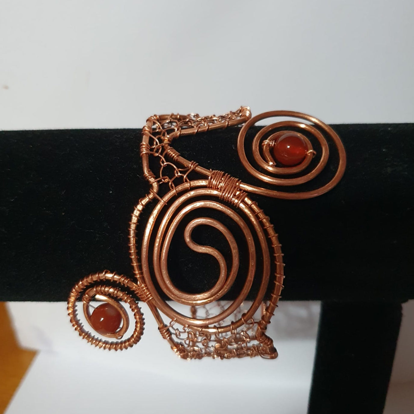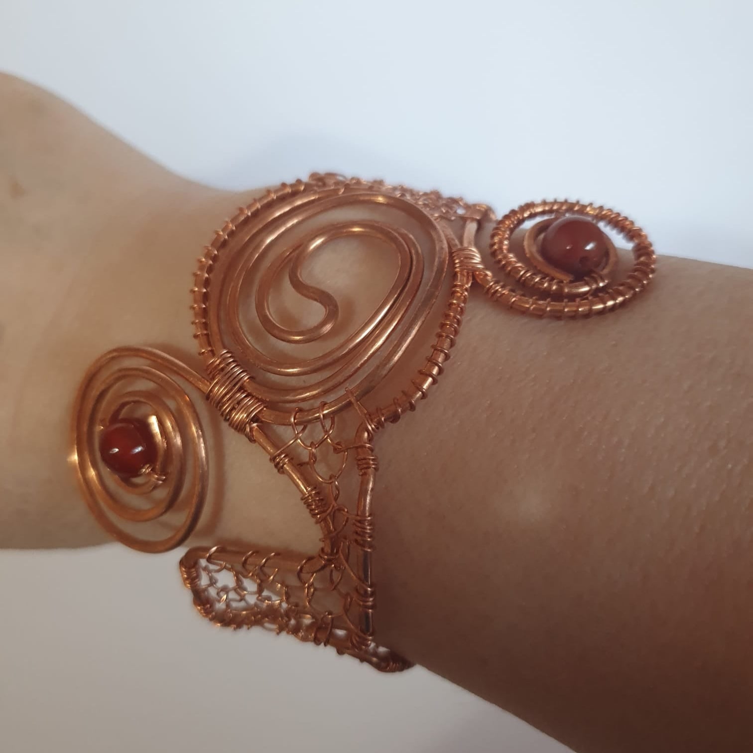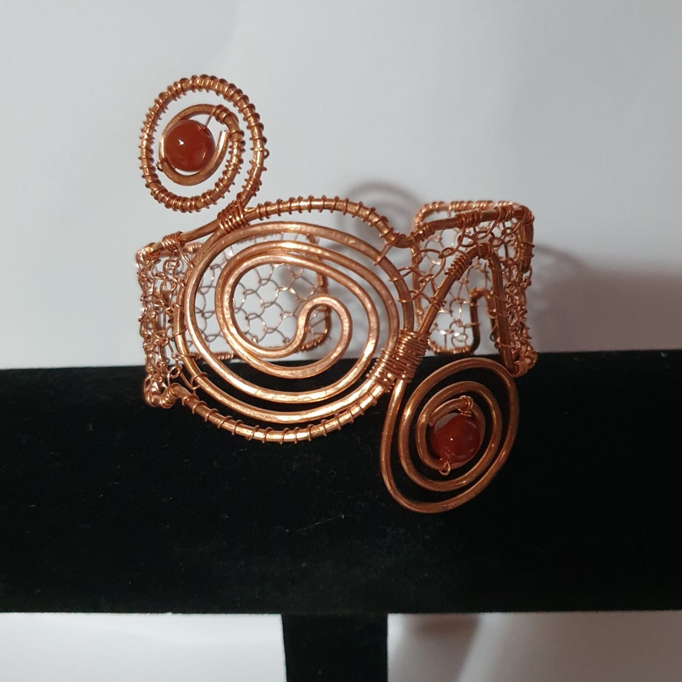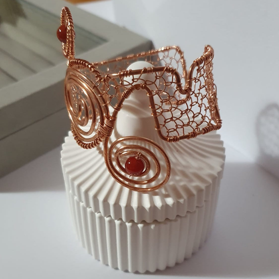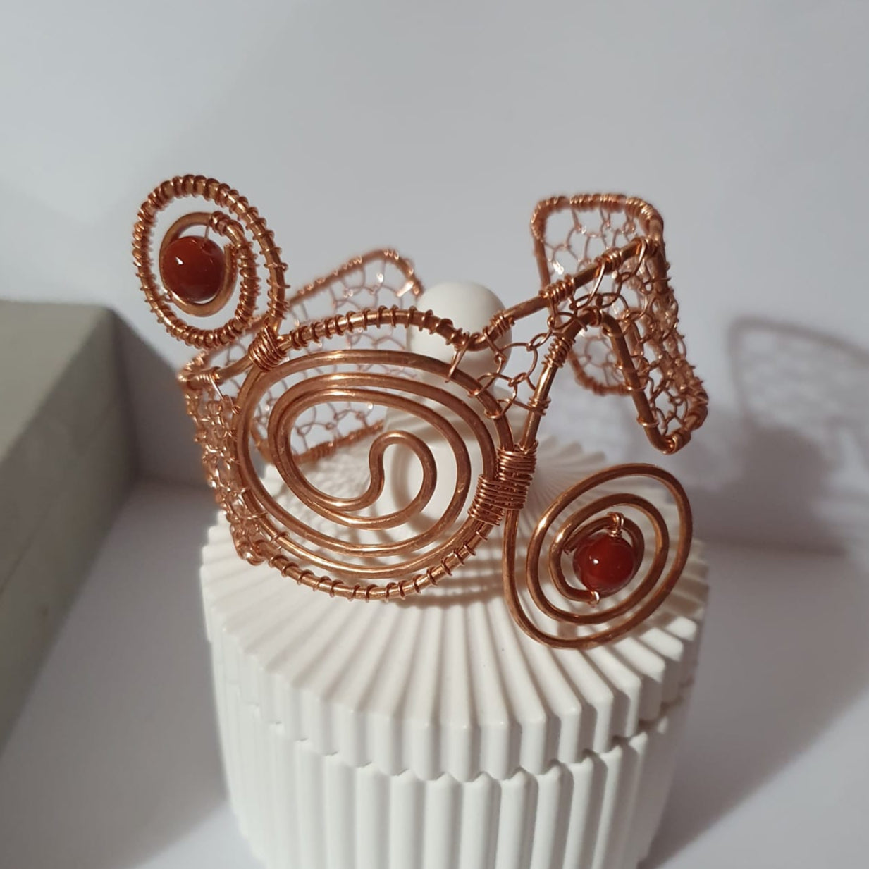 Răsfață-te cu măiestria luxoasă a brățării noastre cusute din cupru! Cusută manual cu sârmă subțire de cupru și împodobită cu mărgele semiprețioase, această brățară emană eleganță și stil. Perfectă pentru a adăuga o notă de sofisticare oricărei ținute. Îmbunătățește-ți colecția de bijuterii cu această piesă remarcabilă! Mărimea este reglabilă.