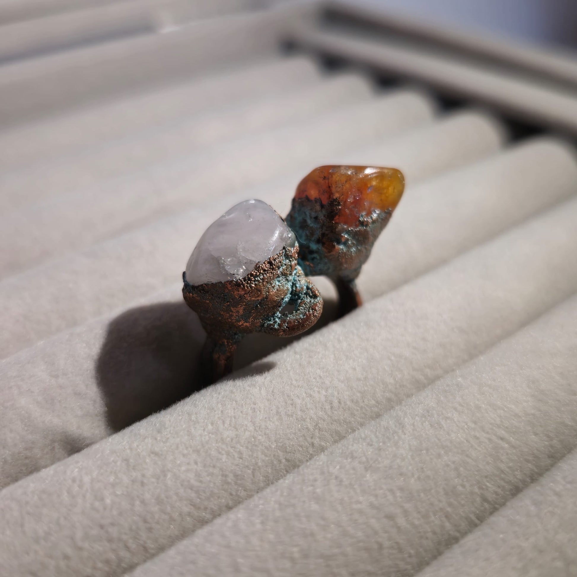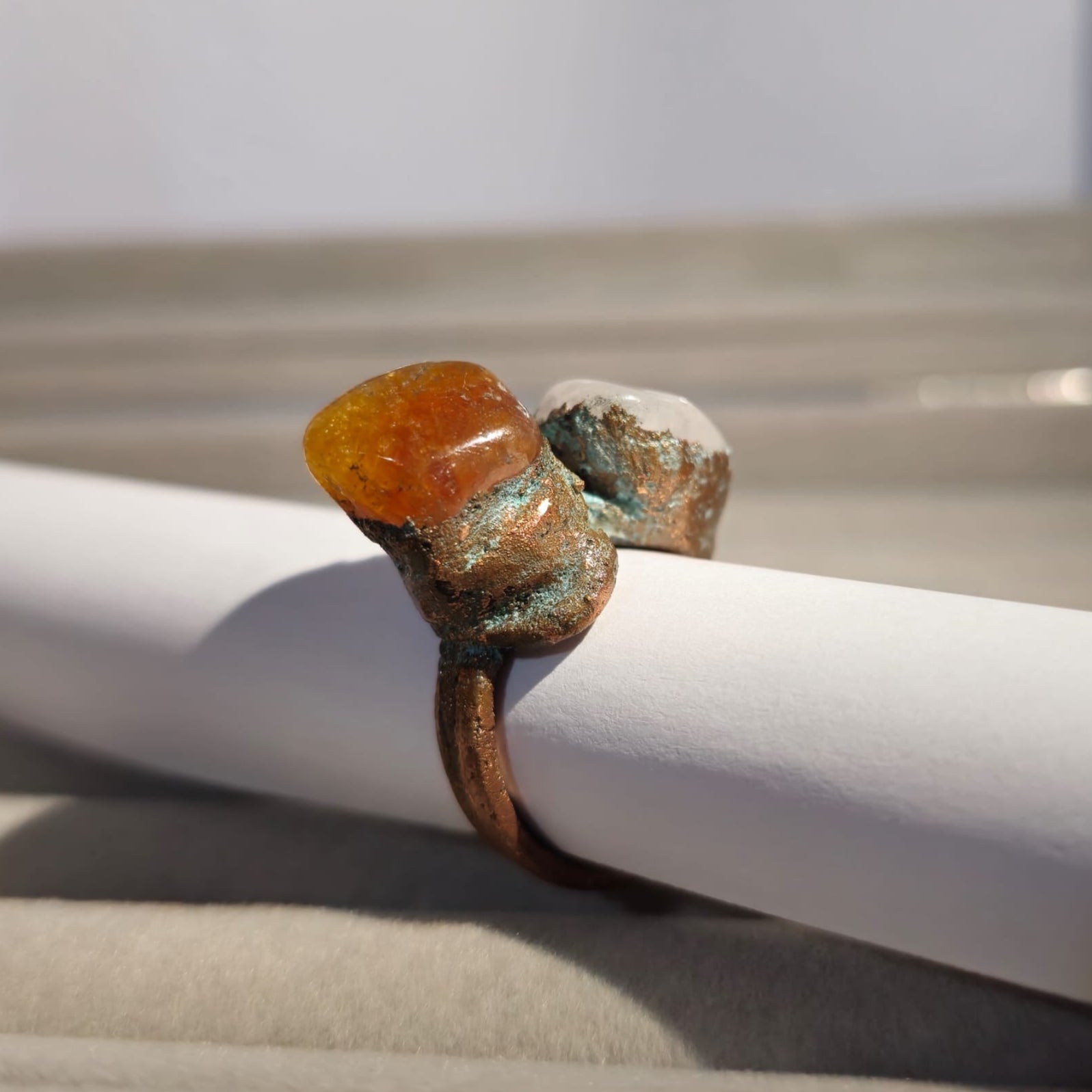 Lucrat manual din cupru electroformat și două pietre de agat superbe, acest inel cu agate duble este completarea perfectă a oricărei colecții de bijuterii. Designul unic și materialele de înaltă calitate îl fac o piesă versatilă, potrivită pentru orice ocazie. Adaugă o notă de eleganță stilului tău cu acest inel atrăgător.