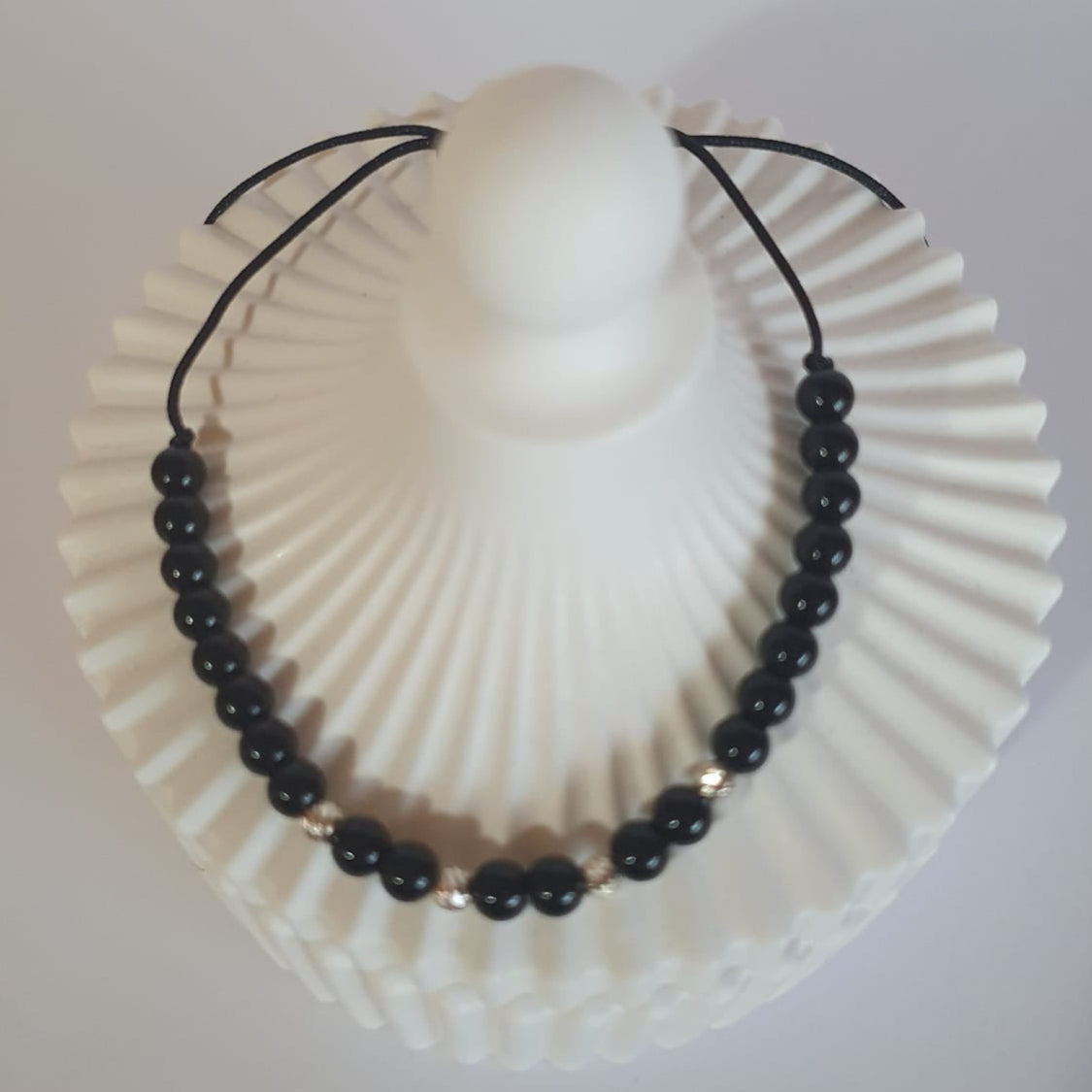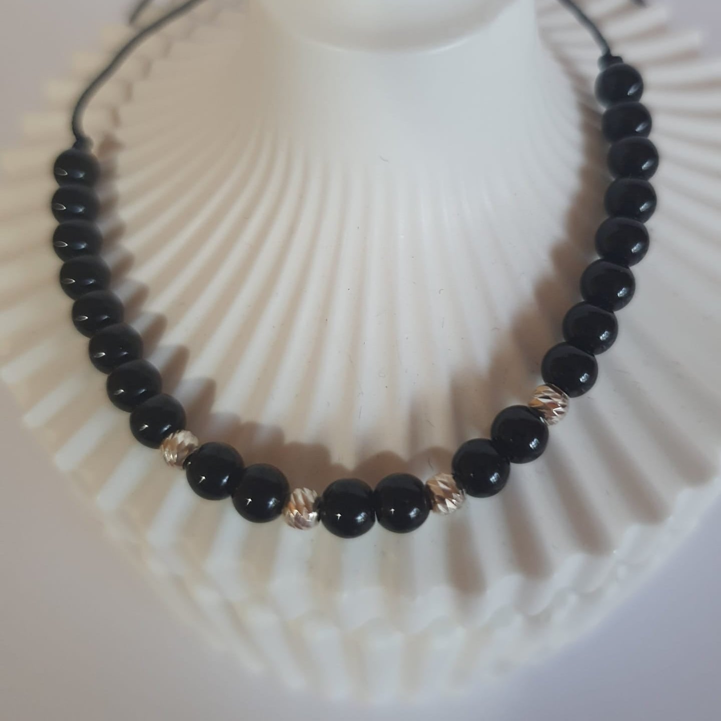 Această brățară elegantă din onix prezintă mărgele de onix șlefuite de 4 mm, înșirate cu accente argintii elegante, creând un accesoriu atemporal care completează orice ținută. Designul său rafinat adaugă o notă de sofisticare, fiind perfectă atât pentru purtarea de zi cu zi, cât și pentru ocazii speciale. Ridicați-vă stilul fără efort cu această piesă versatilă.