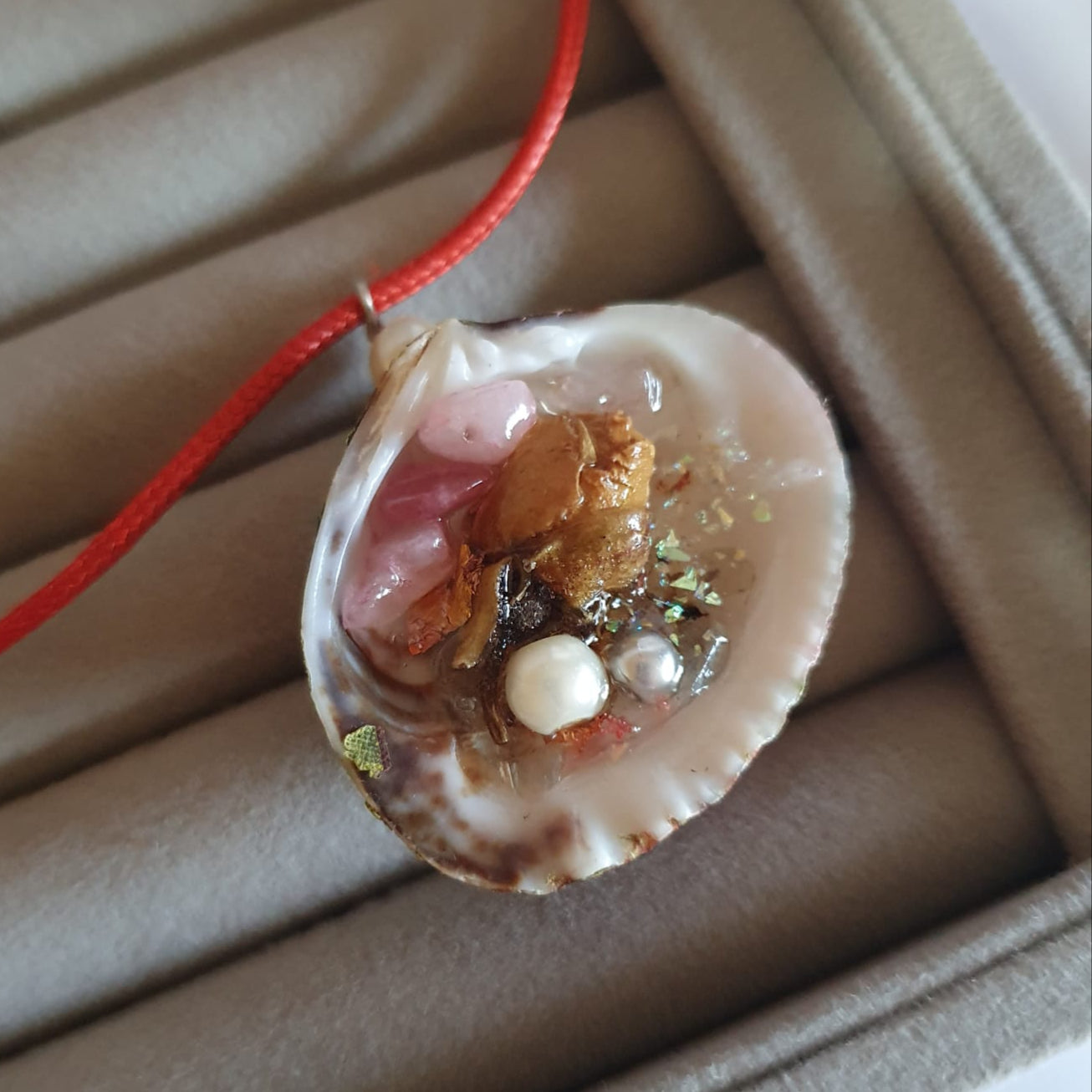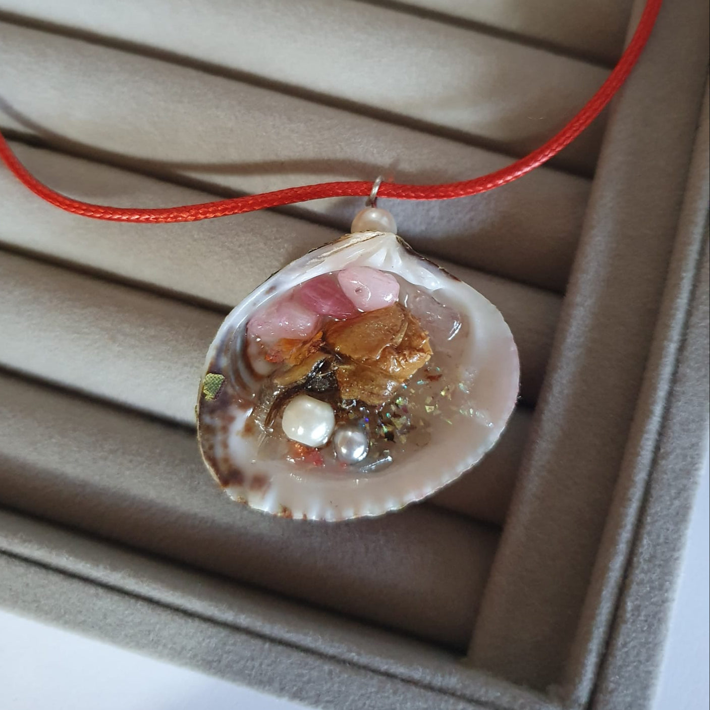 Îmbrățișează frumusețea mării cu colierul nostru cu scoici. Această piesă uimitoare prezintă o scoică adevărată, împodobită cu mărgele delicate, și un trandafir natural uscat, prins în rășină. Un plus unic și elegant pentru orice ținută, amintindu-ți de comorile încântătoare ale oceanului.