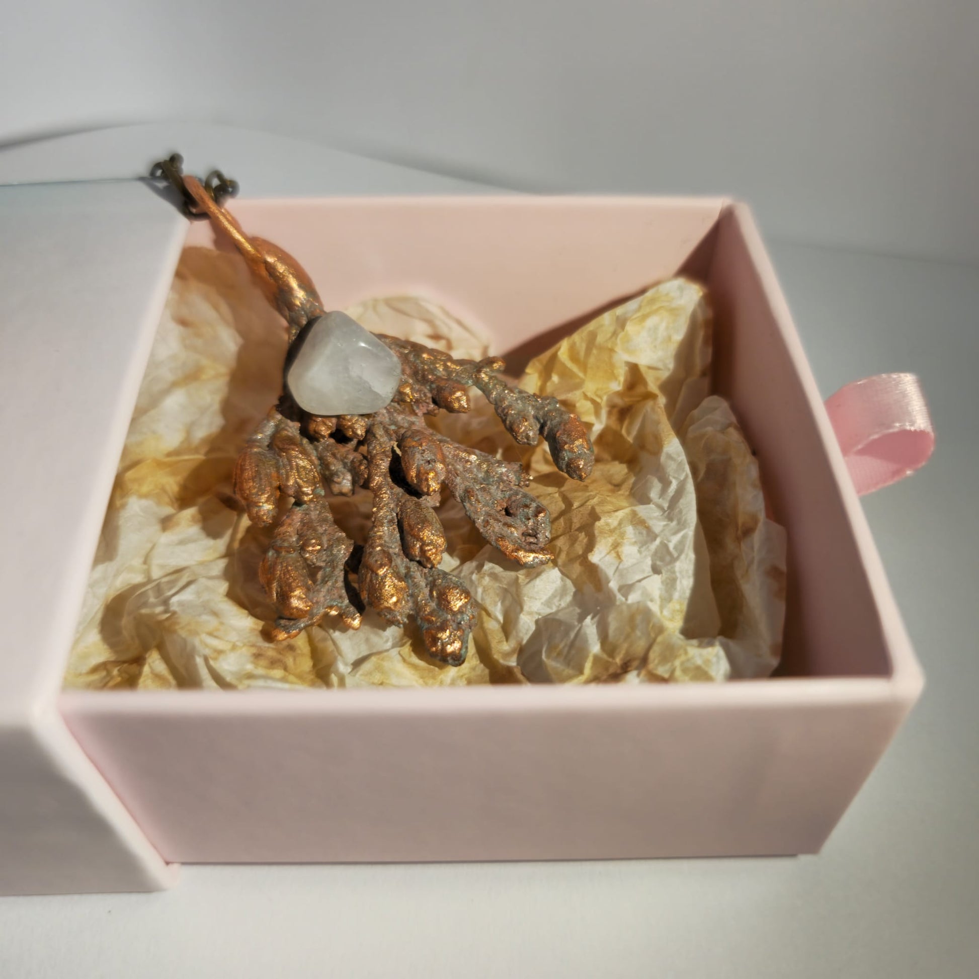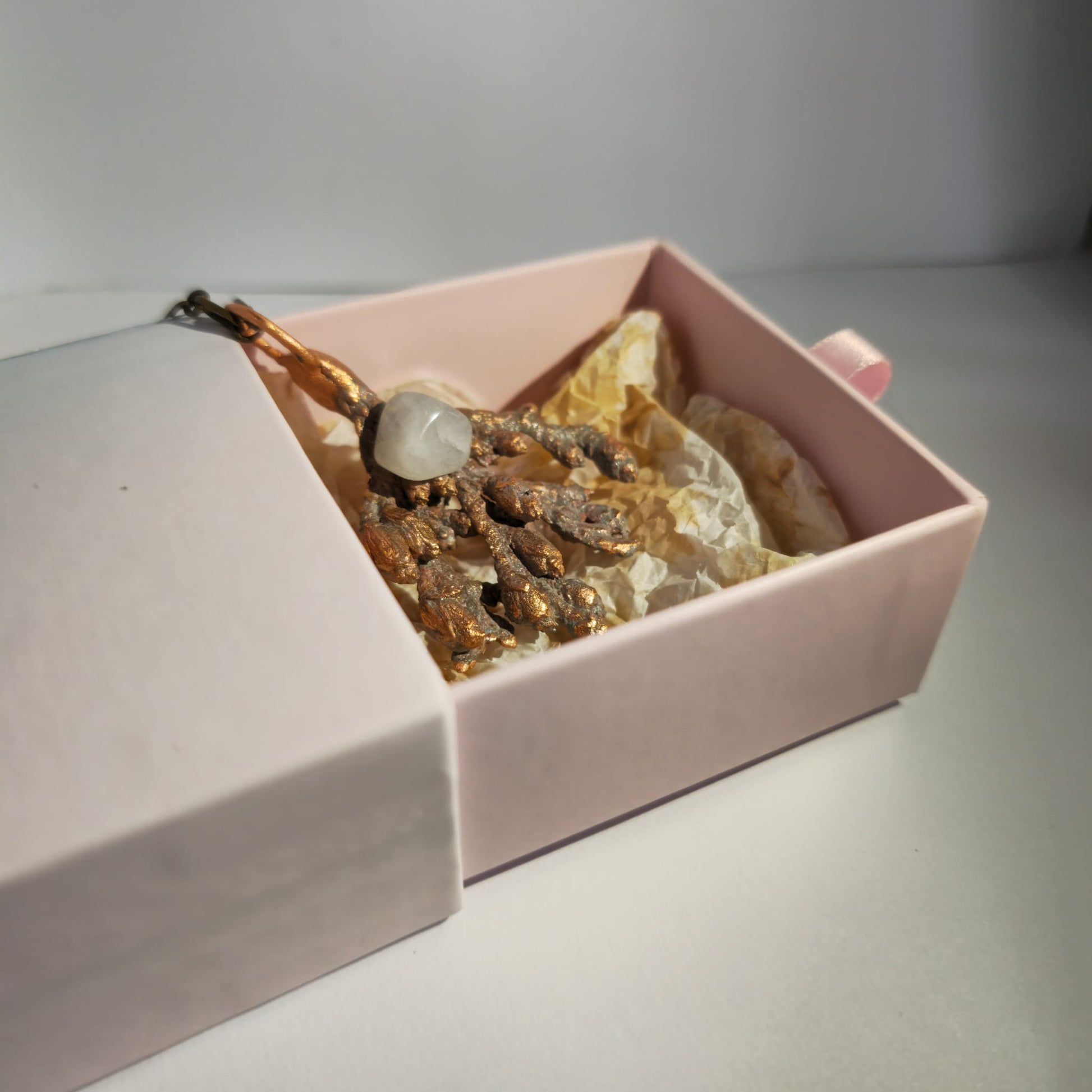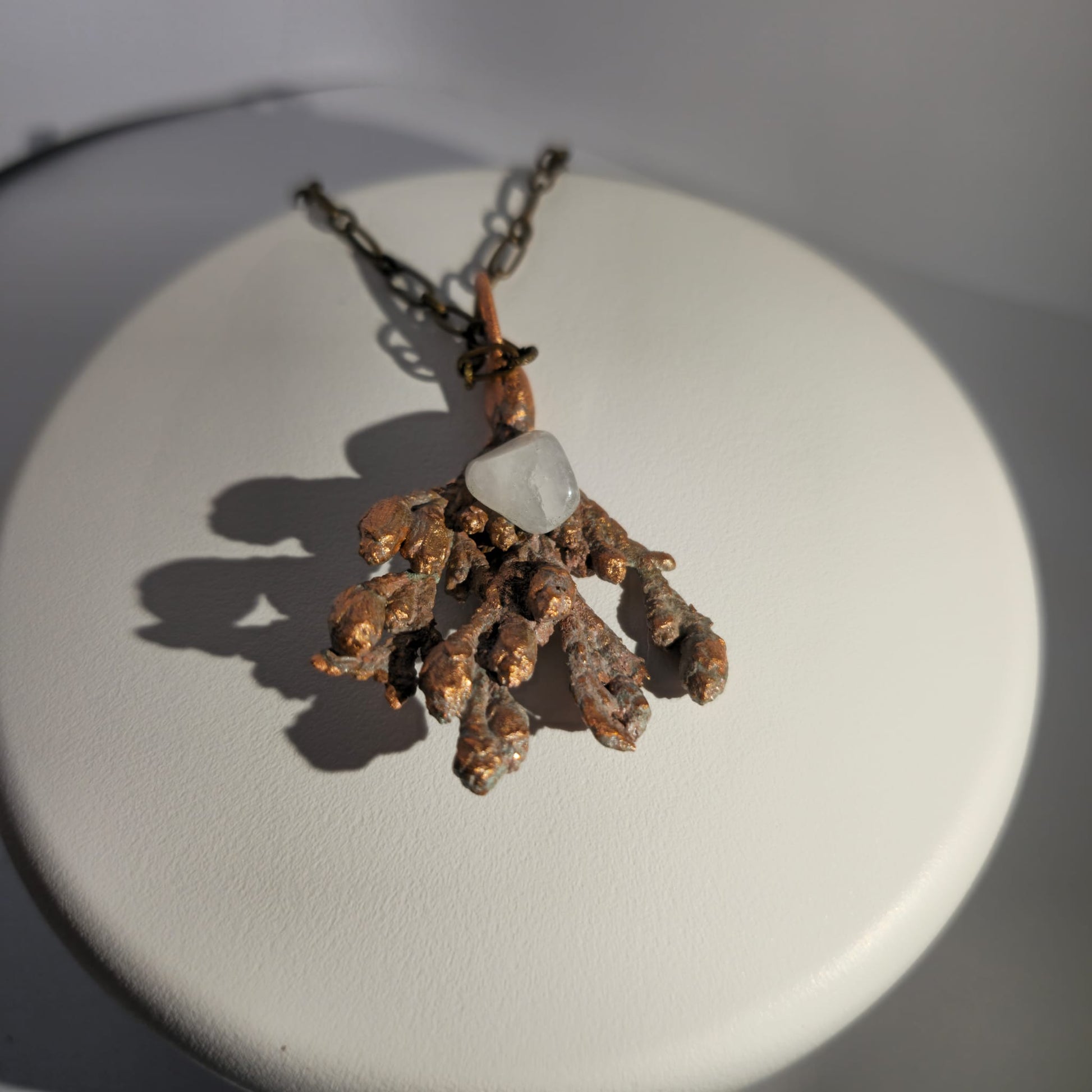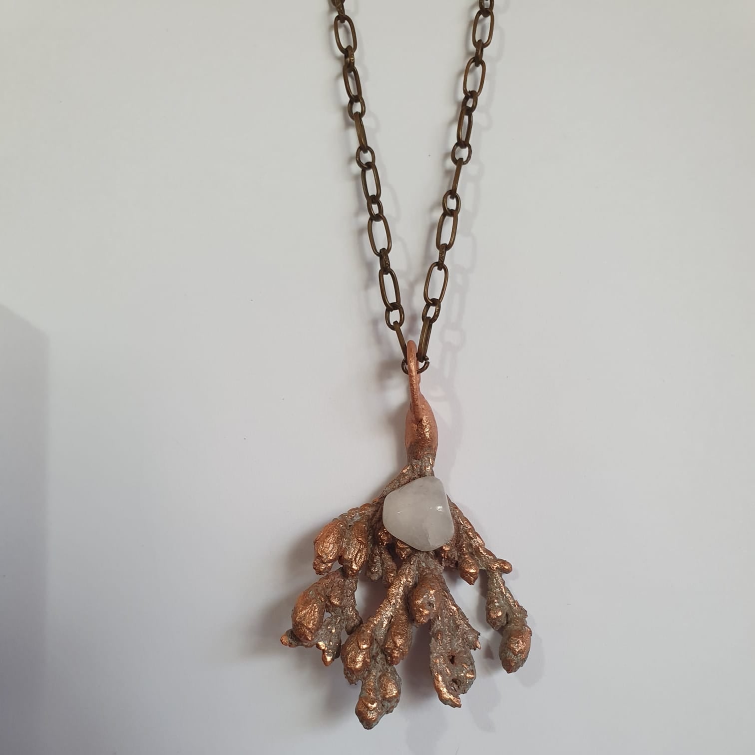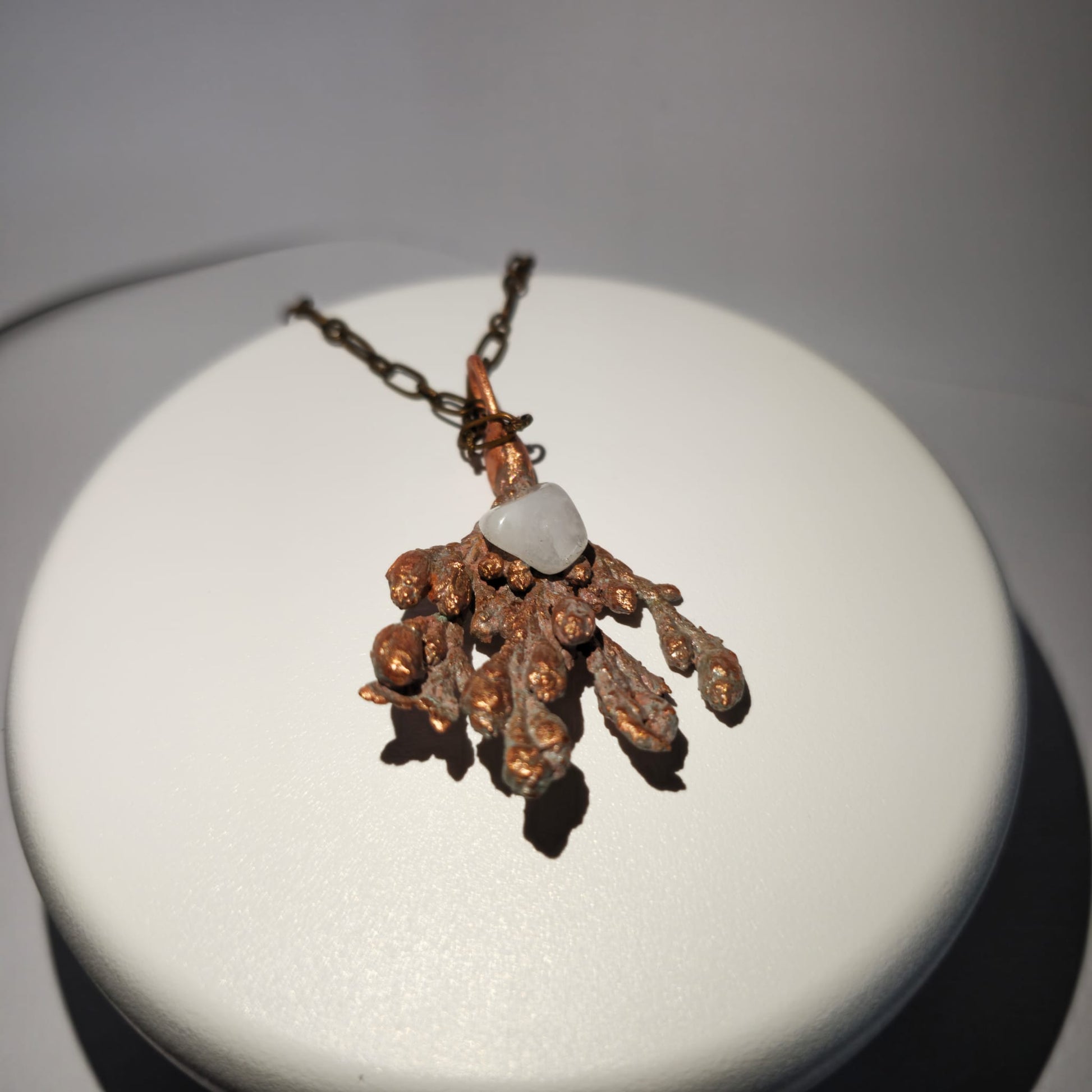 Acest colier lucrat manual prezintă o ramură naturală de tuia acoperită cu cupru electroformat, completată de o piatră de agat. Lucrat cu măiestrie, acest colier unic aduce o notă de natură și eleganță oricărei ținute. Fiecare piesă este unică în felul ei, ceea ce îl face un element indispensabil pentru orice colecție de accesorii.